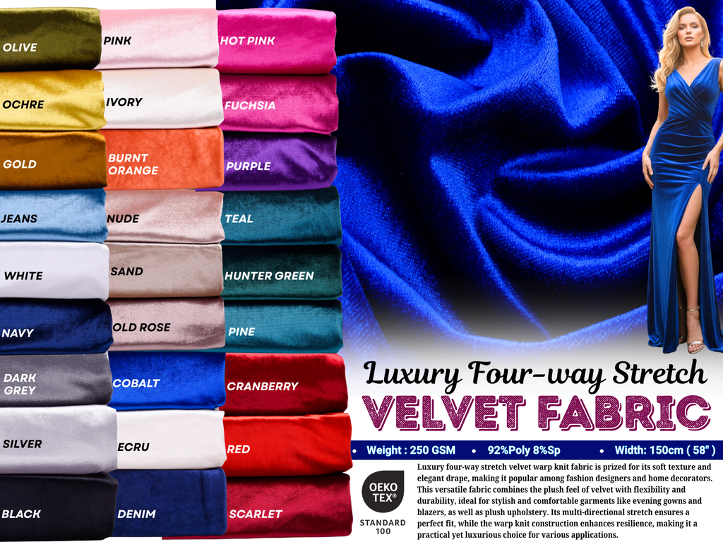 Luxury Four Way Stretch Glass Velvet Fabric features a rich, soft velvet surface with excellent elasticity and a smooth, elegant drape. Designed with four-way stretch, this premium velvet provides comfort, flexibility, and a flattering fit, making it ideal for form-fitting garments and statement fashion pieces. The plush texture and luminous finish create a sophisticated look perfect for evening wear, dresses, dancewear, tops, leggings, costumes, and luxury apparel. This versatile stretch velvet combines durability with a luxurious feel, making it a favorite for both fashion designers and sewing enthusiasts.