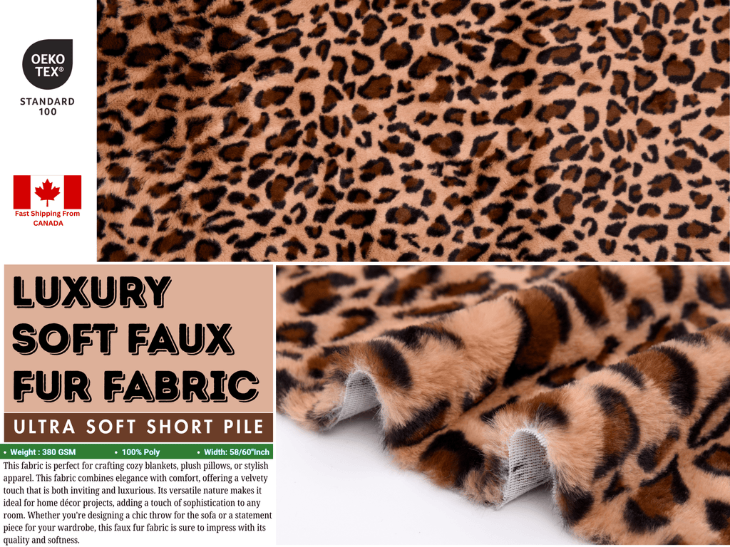 Bring a touch of wild elegance to your creations with Luxury Soft Faux Fur Safari Print Fabric, a beautifully plush faux fur featuring a classic leopard pattern with a refined, timeless look. Designed with a soft short pile, this fabric offers a rich texture that feels cozy, smooth, and luxurious to the touch.