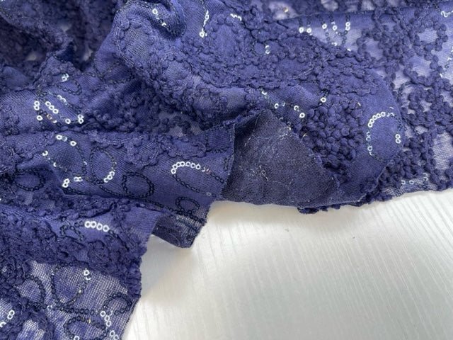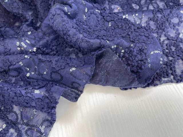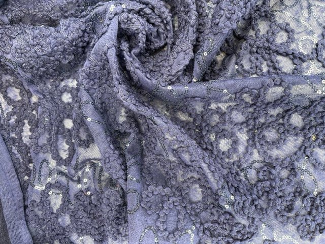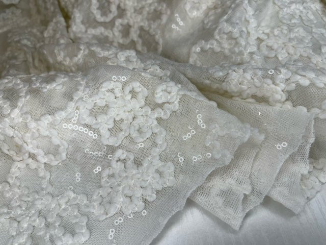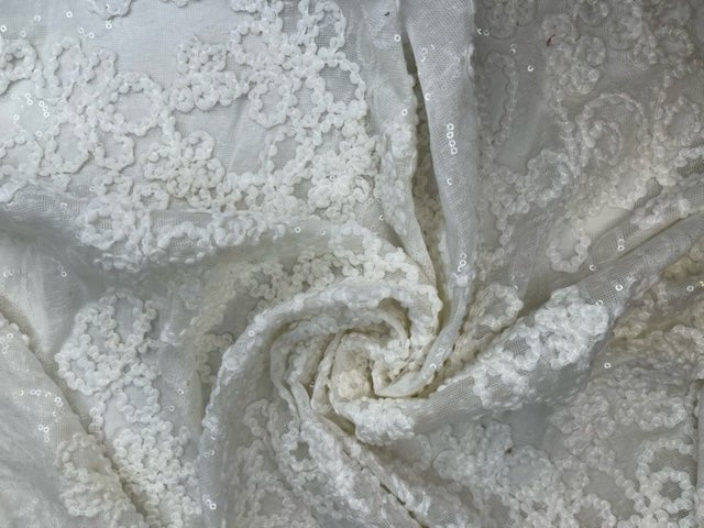 The sequins are delicately sewn onto the cord embroidery, creating a sophisticated pattern that catches the light with every movement. The raised texture of the flamme combined with the intricate detailing provides a rich, luxurious feel, suitable for a range of fashion and decorative purposes.